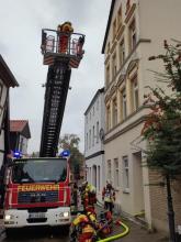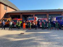 Auf dem Foto sind Ausbilder und Teilnehmer/innen vor der Feuerwache Porta Westfalica zu sehen.