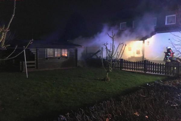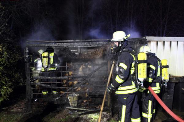 Herrendienstweg: dort brannte ein an eine Garage angebauter Holzunterstand. Das Feuer hatte ebenfalls auf die Garage übergegriffen.