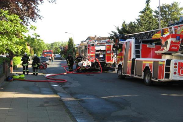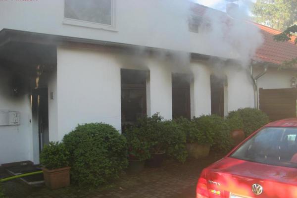 Beim Eintreffen der ersten Einsatzkräfte stand das Erdgeschoss des Wohnhauses im Vollbrand. Entgegen der ersten Meldung, dass eine Person in der Wohnung vermisst wurde, befanden sich alle Bewohner im Vorgarten des Hauses.
