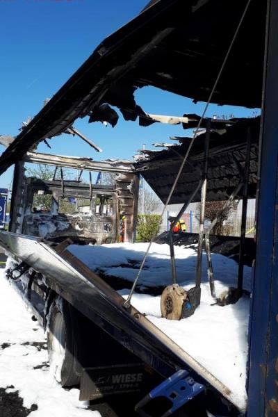 Ein auf der Ladefläche des ausgebrannten Lastkraftwagens befindlicher Elektrohubwagen brannte ebenfalls komplett aus. Die Löscharbeiten hier gestalteten sich aufwendiger, da das Feuer von der Batterie aus immer wieder aufflammte.