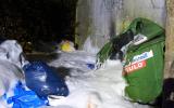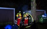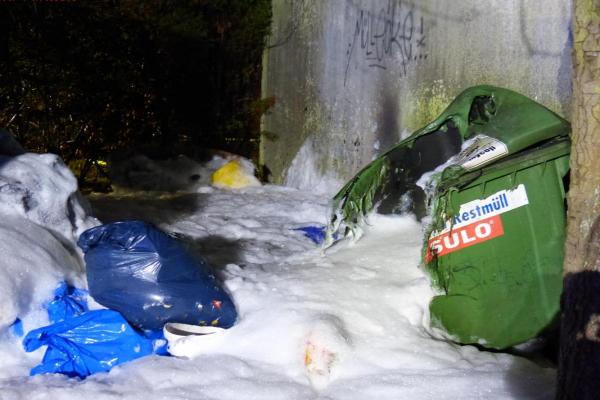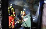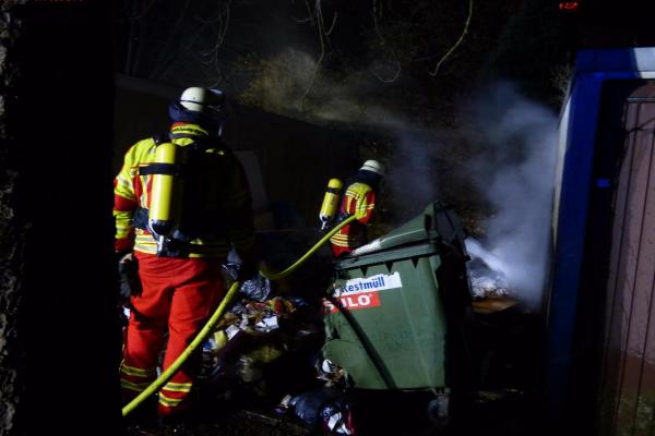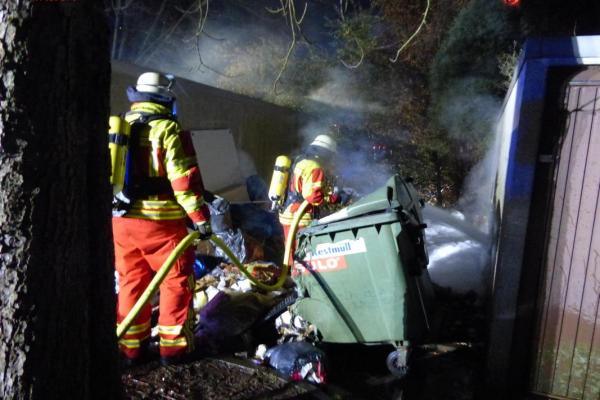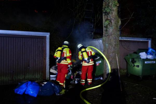 Beim Eintreffen der ersten Einsatzkräfte brannten mehrere Mülltonnen und Unrat zwischen zwei Garagen. Unter Vornahme von 1 C-Hohlstrahlrohr konnte ein Trupp unter Atemschutz das Feuer schnell ablöschen. Ein Übergreifen auf die Garagen wurde verhindert. Abschließend wurden mit einer Schaumpistole Glutnester mit Schaum abgedeckt. Personen waren nicht in Gefahr.