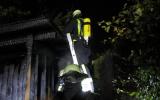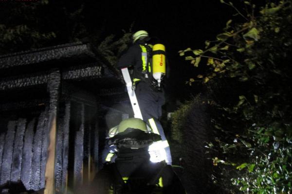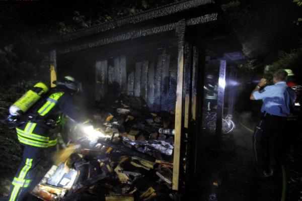 Beim Eintreffen der ersten Einsatzkräfte stand entgegen der ersten Meldung "Flächenbrand" ein Holz- und Fahrradunterstand in Vollbrand. Zwei Trupps unter Atemschutz nahmen mit 2 C-Rohren die Brandbekämpfung auf. Das Feuer war nach kurzer Zeit unter Kontrolle. Längere Nachlöscharbeiten schlossen sich aufgrund der direkt angrenzenden Baum- und Heckenbepflanzung an.