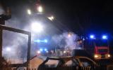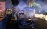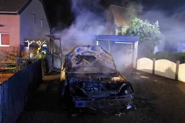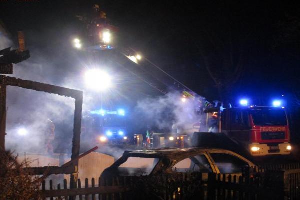 Beim Eintreffen der ersten Einsatzkräfte standen die Garage und das Carport in Vollbrand. Vor dem Carport stand ein PKW in Vollbrand. Aufgrund der Bauweise bestand die große Gefahr des Übergreifens auf zwei Wohnhäuser, die sich direkt neben dem Garagenkomplex befanden. Unter Vornahme von insgesamt sechs C-Rohren wurde eine Riegelstellung aufgebaut. Der Brand konnte dann zügig unter Kontrolle gebracht und abgelöscht werden. Insgesamt kamen acht Trupps unter Atemschutz zum Einsatz.