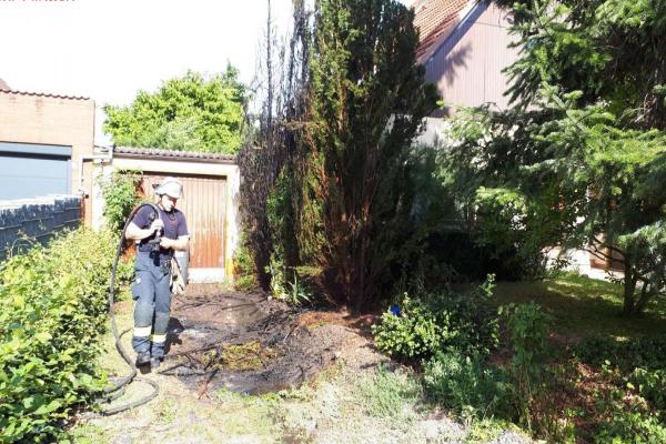 Beim Eintreffen der ersten Einsatzkräfte brannte eine Lebensbaumhecke. Mit der Schnellangriffseinrichtung des Hilfeleistungslöschfahrzeuges konnte der Brand schnell gelöscht werden. Nachbarn hatten schon vor Eintreffen der Feuerwehr mit Gartenschläuchen das Feuer unter Kontrolle gebracht und somit das Übergreifen auf das angrenzende Wohnhaus verhindert.