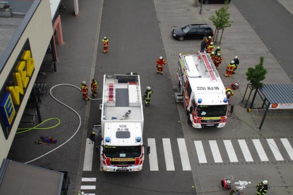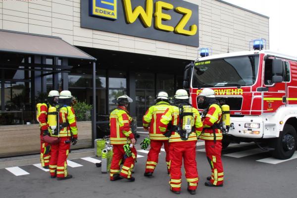 Alarmiert wurde die Feuerwehr durch die Auslösung der Brandmeldeanlage in einem Lebensmittelmarkt. Beim Eintreffen der ersten Einsatzkräfte wurde eine starke Verrauchung und ein Brand im Bereich der Leergutannahme festgestellt. Die Kunden konnten aufgrund des Brandmeldealarms den Markt zügig verlassen. Wegen der starken Verrauchung im gesamten Markt wurde eine Alarmstufenerhöhung auf "Brand Industriebetrieb" vorgenommen. Weitere Kräfte wurden zur Einsatzstelle beordet. Ein mit Atemschutz ausgerüsteter Angriffstrupp löschte den Brand mit einem C-Hohlstrahlrohr ab und brachte die Container mit den verbrannten Plastikflaschen ins Freie.