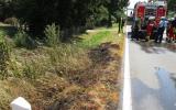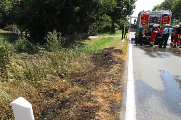 Beim Einreffen der ersten Einsatzkräfte stand direkt an der Stemmer Landstraße der Grünstreifen auf circa 10 Quadratmeter in Brand und drohte auf ein angrenzendes Getreidefeld überzugreifen.