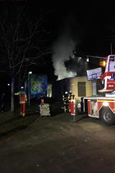 Die Zugänglichkeit zum Objekt war erschwert. Zunächst verschafften sich die Einsatzkräfte gewaltsam Zugang zum Schadensobjekt. Von Außen war eine starke Rauchentwicklung wahrnehmbar. Mit mehreren Trupps wurde eine Brandbekämpfung im Innenangriff durchgeführt. Es mussten mehrere Zwischendecken sowie die Dachhaut geöffnet werden. Es schlossen sich umfangreiche Belüftungsmaßnahmen, auch im Hauptgebäude an. Die Berufsfeuerwehr führte am Mittag Nachlöscharbeiten durch