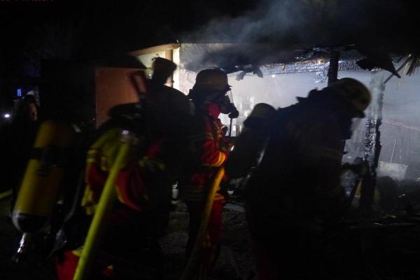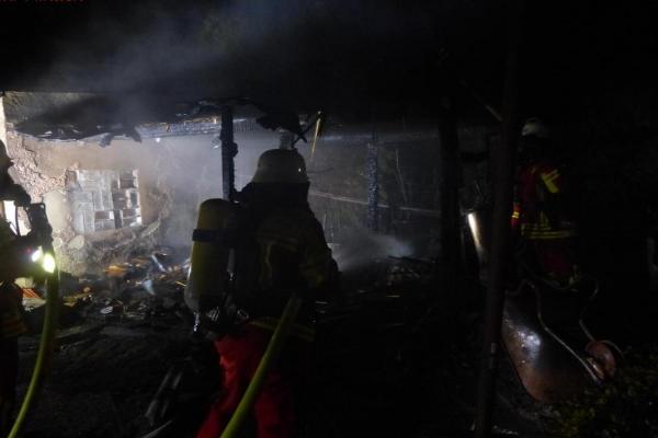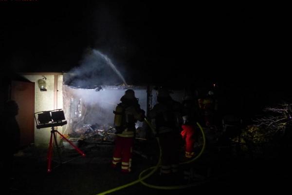 Beim Eintreffen der ersten Einsatzkräfte stand eine, an einer Garage angebaute Gartenhütte, im Vollbrand. Anwohner hatten schon mit Gartenschläuchen mit Löscharbeiten begonnen. Unter Vornahme von 2 C-Rohren konnte das Feuer dann schnell gelöscht werden. Ein Übergreifen auf die Garage wurde verhindert. Abschließend wurden mit einer Schaumpistole Glutnester mit Schaum abgedeckt. Zwei Trupps unter Atemschutz kamen zum Einsatz. Personen waren nicht in Gefahr. Der Einsatz konnte nach circa einer Stunde beendet werden. Insgesamt waren circa 30 Feuerwehrkräfte im Einsatz.