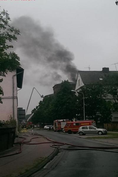 Beim Eintreffen der Feuerwehr stand bereits ein Schenkel des Daches eines U-förmigen unbewohnten ehemaligen Kasernengeäudes auf einer Länge von ca. 30 m in Vollbrand. Während der Löscharbeiten breitete sich der Brand auf einen weiteren ca. 30 m langen Schenkel aus. Die Ausbreitung auf den 3. Schenkel konnte verhindert werden. Während der Löscharbeiten wurde ein Anwohner eines benachbarten Wohnhauses mit dem Verdacht auf Rauchgasintox ins Klinikum Minden verbracht. Aufgrund des schweren Gewitters wurden die Löscharbeiten während dieser Zeit über die Hubrettungsgeräte eingestellt. Ein Blitz schlug in der Nähe eines Löschgruppenfahrzeuges ein und beschädigte dieses. In der Spitzenzeit der Löscharbeiten wurden ca. 200 Feuerwehrangehörige eingesetzt und ca. 12.000 l Wasser pro Minute abgegeben. Aufgrund der starken Rauchentwicklung wurden die Bewohner der östlichen Mindener Stadtteile aufgefordert ihre Türen und Fenster zu schließen. Schadstoffmessungen wurden durchgeführt, ergaben jedoch keine Konzentrationen oberhalb der Grenzwerte. Insgesamt waren bis zum jetzigen Zeitpunkt mehr als 300 Einsatzkräfte an der Einsatzstelle. Dadurch, dass mehrere Punkte der Dachkonstruktion sehr schwer zu erreichen sind, werden sich die Löscharbeiten mindestens noch bis in die Nacht hinziehen.