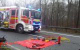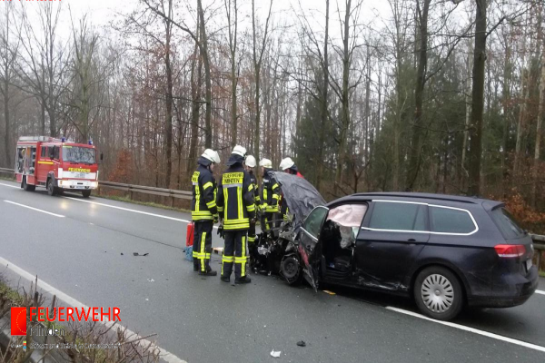 Durch den Zusammenstoß zweier PKW wurde ein Fahrer in seinem PKW eingeklemmt. Er wurde durch das Unfallereignis lebensgefährlich verletzt. Der Fahrer musste durch die Feuerwehr mit hydraulischem Rettungsgerät befreit werden.