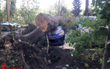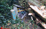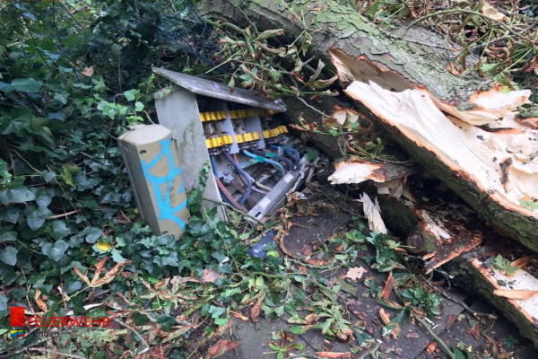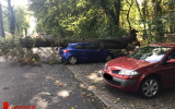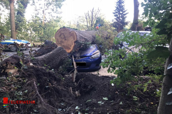 Umgestürzter Baum auf PKW. Keine verletzten Personen. Der Baum beschädigte einen Stromverteilerkasten