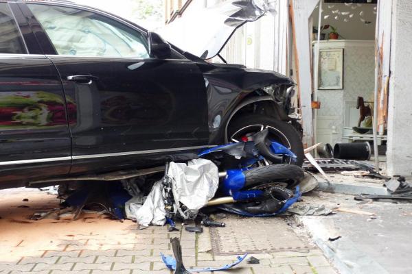 rechts auf den Gehweg, überrollte ein dort abgestelltes Motorrad und kam im Eingangsbereich eines Ladenlokals zum Stehen.