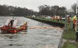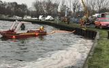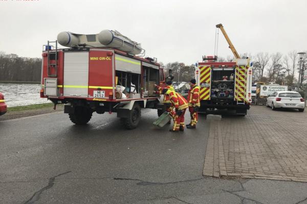 Nach Rücksprache zwischen Kreisumweltamt, Wasserschutzpolizei, Wasserschifffahrtsamt und Feuerwehr wurde entschieden, dass ein Teil der Verschmutzung mittels Ölsperren aufgenommen werden soll. Hierzu wurde durch die Feuerwehr ein Mehrzweckboot zu Wasser gebracht, um die Ölsperre wasserseitig ziehen zu können. Am Land wurde dieses über Seilverbindungen mit der Sperre durch Feuerwehrangehörige sicher gestellt. Die Verunreinigungen wurden zusammen gezogen und mittels der saugfähigen Ölsperren aufgenommen. Anschließend wurden die Ölsperren dem Gewässer entnommen und fachgerecht entsorgt.