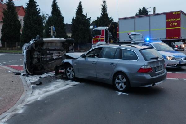 Die Erkundung an der Einsatzstelle ergab, das es einen Zusammenstoß von 2 Autos im Kreuzungsbereich Hessenring & Stiftsallee gegeben hat. Ein Auto wurde bei dem Zusammenstoß auf die Seite gekippt. Bei dem Unfall wurden insgesamt 3 Personen leicht verletzt, wobei keine Person in den PKW´s eingeklemmt war. Die verletzten Personen wurden für die weitere medizinische Versorung dem Rettungs-dienst übergeben. Im weiteren Einsatzverlauf wurden die Fahrzeugbatterien abge-klemmt und auslaufende Betriebsflüssigkeiten aufgenommen.