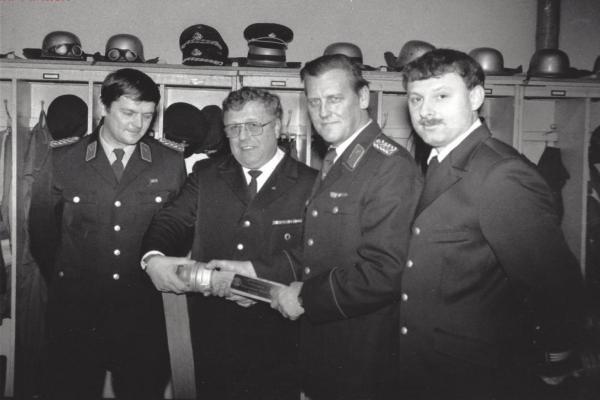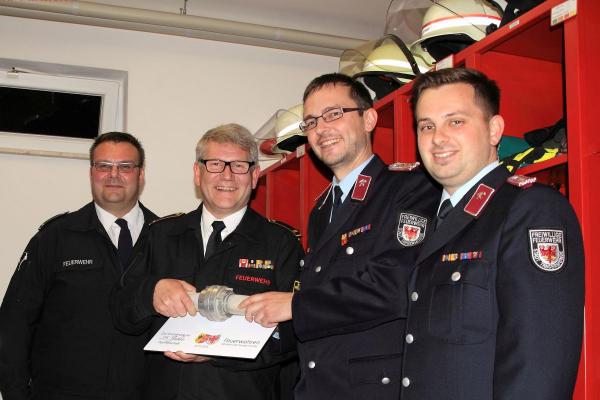Das Symbol der Gründung der Partnerschaft die Schlauchkupplungen fanden sich in einem durch Michael Classe und Rene Tangelmann an Heino Nordmeyer und Ingo Steinhauer überreichten Geschenk wieder. In Zukunft wird in jedem Mindener Feuerwehrhaus dieses Zeichen der gelebten Partnerschaft zwischen den beiden Wehren zu sehen sein.