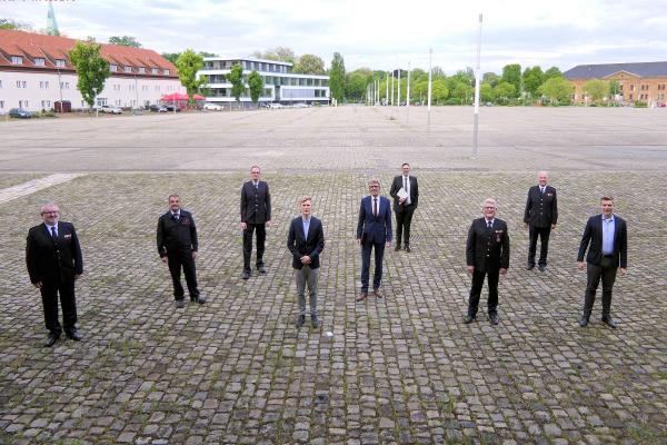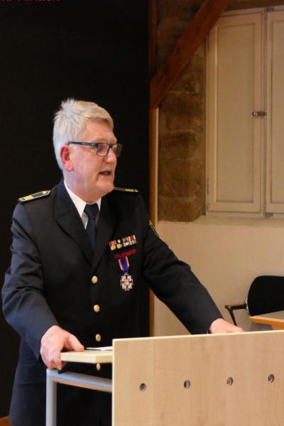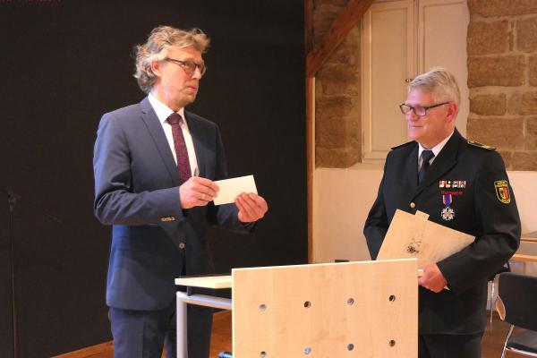 Thomas Lembeck (Essen), Leiter der Arbeitsgemeinschaft der Berufsfeuerwehren in Nordrhein-Westfalen und per Videokonferenz zugeschaltet, dankte Nordmeyer für sein Engagement in der Arbeitsgemeinschaft und auch für Einsätze, die im Rahmen der Bezirksreserve liefen - wie die geleistete Hilfe beim Elbe-Hochwasser 2013. Daran und an weitere Elbe-Hochwasser-Katastrophen in den Jahren 2002 und 2006 – immer mit tatkräftiger Unterstützung aus der Partnerstadt Minden - erinnerte mit einem Online-Grußwort auch Michael Classe, Sachgebietsleiter Allgemeine Gefahrenabwehr in Tangermünde.