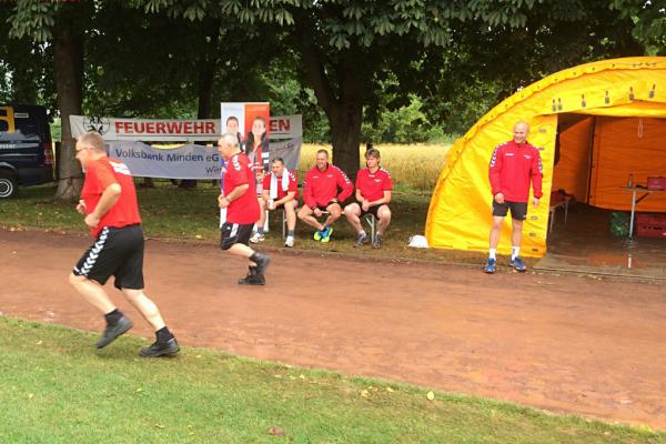 Als die Löschgruppe Hahlen zusammen mit ihrer Jugendgruppe am Freitagabend um 18 Uhr zur Eröffnungsrunde antrat, ließ ein Blick gen Himmel schon erahnen, dass sicher noch der eine oder andere Tropfen vom Selbigen fallen würde. Allerdings ließen sich weder die Hahler, noch die Löschgruppen Rechtes Weserufer, Leteln, Haddenhausen und der Löschzug Stadtmitte von den teils kräftigen Schauern davon abhalten, bis tief in die Nacht hinein Runde um Runde über die schlammige Aschebahn zu laufen.