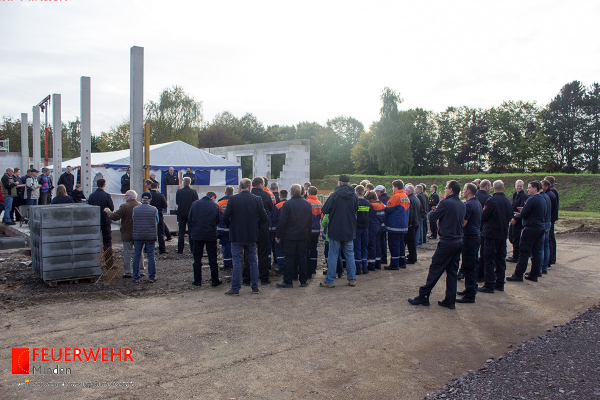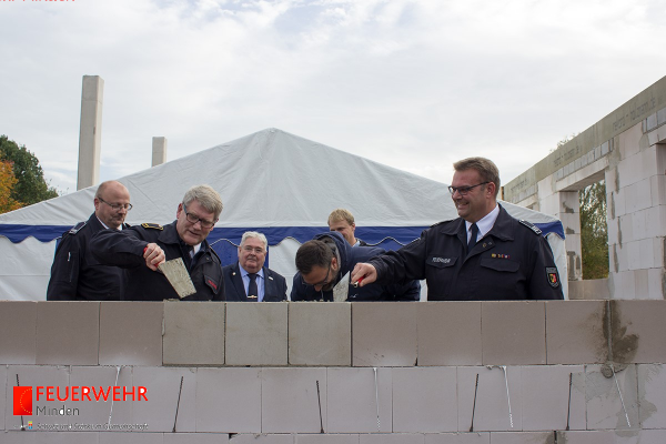 Am 02.10.2017 konnte in Hahlen am Mühlenfeld die festliche Grundsteinlegung für das neue Feuerwehrhaus der Löschgruppe Hahlen begangen werden. Der stv. Bürgermeister Egon Stellbrink konnte im Beisein von Brandrat Heino Nordmeyer (Leiter Feuerwehr Minden), Stadtbrandinspektor Ingo Steinhauer (Sprecher Freiwillige Feuerwehr Minden), Brandoberinspektor Thomas Rohlfing (Löschgruppenführer Hahlen) und Lars Bursian (Beigeordneter für Städtebau und Feuerschutz) unter den Augen vieler Gäste, darunter auch Dietrich Ante und Günter Weßel vom Feuerschutzausschuss der Stadt Minden, die traditionelle Urne einmauern. Die Urne ist mit den Bauplänen, einer 100-jährigen Chronik der Löschgruppe, einer 25- jährigen Chronik der Jugendfeuerwehr, div. Gruppenbildern und Zeitungsausschnitten gefüllt worden. Stellbrink sowie auch Nordmeyer, Steinhauer und Bursian zeigten sich erfreut über den guten Verlauf der Bauarbeiten, welche vom Ing.-Büro Schöne aus Minden geleitet werden. Die Fertigstellung des Neubaus ist für den Herbst 2018 geplant. Auf dem 6.800qm großen Gelände werden in Zukunft 573qm bebaute Fläche das neue Domizil der Löschgruppe einnehmen, welches mit 3 Fahrzeugtoren, Lager- und Technikräumen, einem Schulungsraum, Sozialräumen, einer Küche und einem eigenen Raum für die Jugendfeuerwehr ausgestattet sein wird.