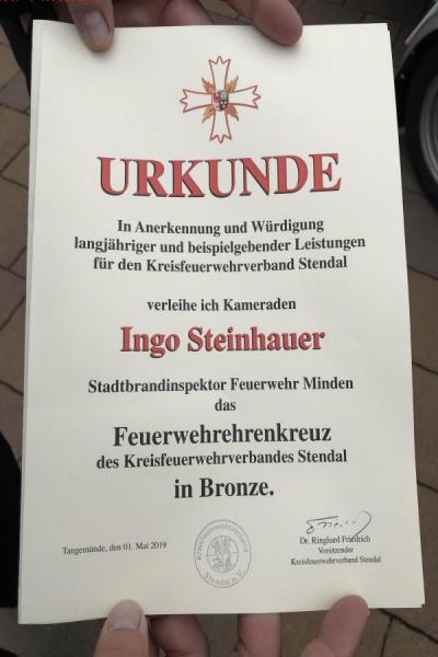 Zum Tag der offenen Tür der Feuerwehr Tangermünde am 01.05.2019 wurde der Stadtbrandinspektor und ehemalige Sprecher der freiwilligen Feuerwehr Minden, Ingo Steinhauer, durch den Kreisbrandmeister des Kreises Stendal, Ringhard Friedrich, und dem Bürgermeister der Stadt Tangermünde, Jürgen Pyrdok, mit dem Feuerwehrehrenkreuz des Kreisfeuerwehrverbandes Stendal in Bronze ausgezeichnet. Ingo Steinhauer baut seit Jahren die Partnerschaft zwischen den Feuerwehren Tangermünde und Minden aus. Zu den ersten Gratulanten zählten die Mitglieder der Feuerwehr Tangermünde sowie die mitgereiste Abordnung der Feuerwehr Minden.