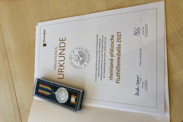 Dieser Einsatz wurde nun durch das Land Rheinland-Pfalz mit einer Fluthilfemedaille gewürdigt. Die Verleihung erfolgte in einer kleinen Feierstunde im Kreishaus durch Kreisdirektorin Cornelia Schöder.
